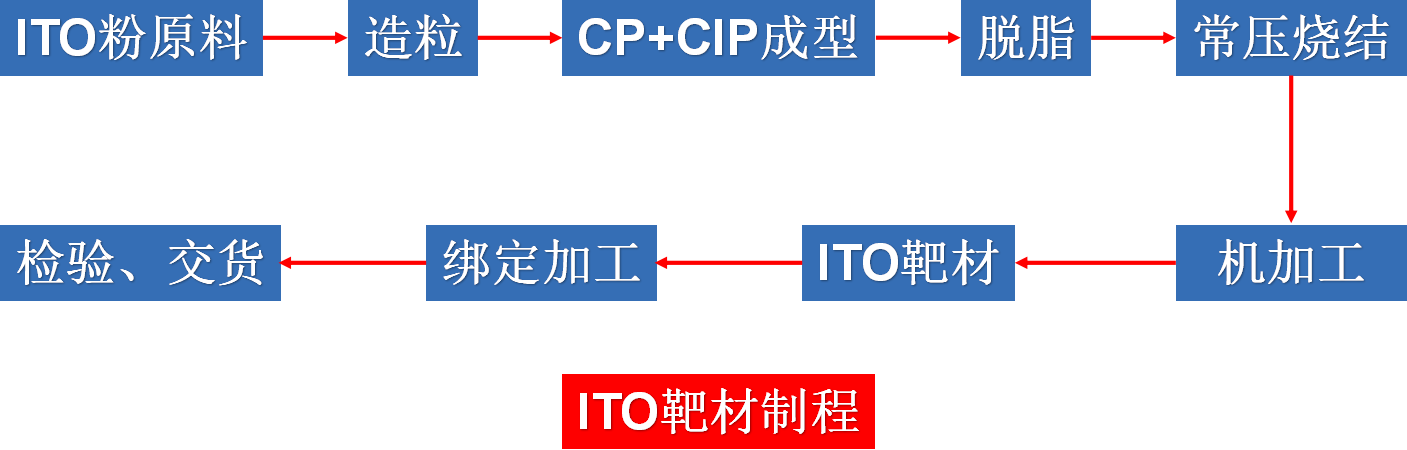其專利 TFT級ITO靶材的常壓燒結方法:選取超高活性ITO納米粉,將造粒后的ITO粉通過模壓成型,成型壓力25~80MPa,保壓時間15~300秒;再經冷等靜壓加固,等靜壓壓力為180~300MPa,保壓時間為300~1200秒;然后直接放入燒結爐中,通入氣氛并以一定的升溫速率,分多段升溫保溫,再以一定的速率進行降溫至室溫來完成燒結。