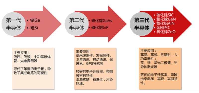 功率半導體發(fā)展經(jīng)歷了以下的發(fā)展歷程,以鍺、硅等單晶體材料為代表的第一代半導體材料,以砷化鎵、磷化銦等化合物為代表的第二代半導體材料,以碳化硅、氮化鎵為代表的第三代半導體材料。