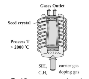 在密閉反應器中,保持合適的反應溫度(2000-2300℃)和壓力(40kPa),反應爐內(nèi)通入由H2或者He載帶的SiH4和C2H4。反應氣體在高溫下分解生成碳化硅并附著在襯底材料表面,并沿著材料表面不斷生長。通過控制反應容積的大小、反應溫度、壓力和氣體組分等條件,得到最佳工藝條件。