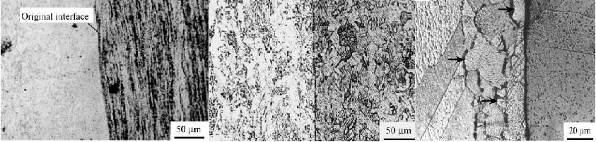 而su[2]等學者研究發現退火處理后的AA1050/AA6061板材經過累積軋制的超細晶多層復合材料在不同道次下界面會呈現不同特征,初始三個道次內,不同鋁合金母材基本上能夠同步協調變形,但是當軋制次數變多時,AA6061界面就會發生頸縮,斷裂,最終發生界面紊亂。