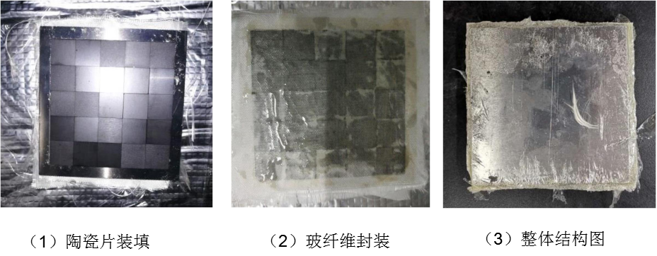 靶板從左到右依次為鋁合金面板、4層玻纖布、鋁合金邊框及陶瓷片、2層玻纖布、鋁合金背板、45號(hào)鋼基板。采用鋁合金邊框?qū)μ沾蓧K進(jìn)行二維約束,再將玻纖布平鋪在陶瓷層的正面和背面(正面鋪上四層玻纖布、背面鋪上兩層玻纖布),正面與背面再用鋁合金板密封,使用聚氨酯膠黏劑將整個(gè)結(jié)構(gòu)在常溫下固化成型為復(fù)合裝甲陶瓷結(jié)構(gòu)件。