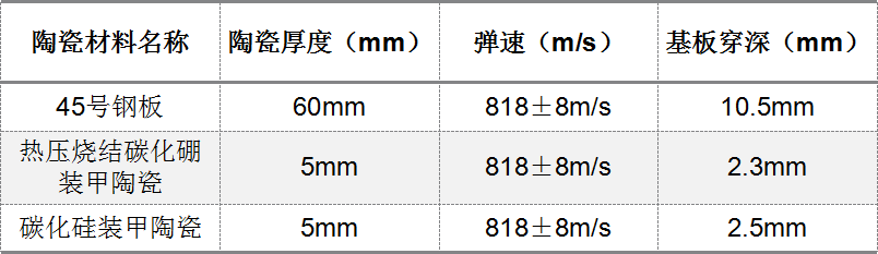 測(cè)試中,采用空白靶最對(duì)比,85式7.62毫米狙擊步槍對(duì)45號(hào)鋼的垂直侵徹深度為10.5mm,以此作為陶瓷復(fù)合裝甲的抗彈性能評(píng)判標(biāo)準(zhǔn)。對(duì)熱壓碳化硼裝甲片、碳化硅裝甲片進(jìn)行抗彈性能進(jìn)行評(píng)估。