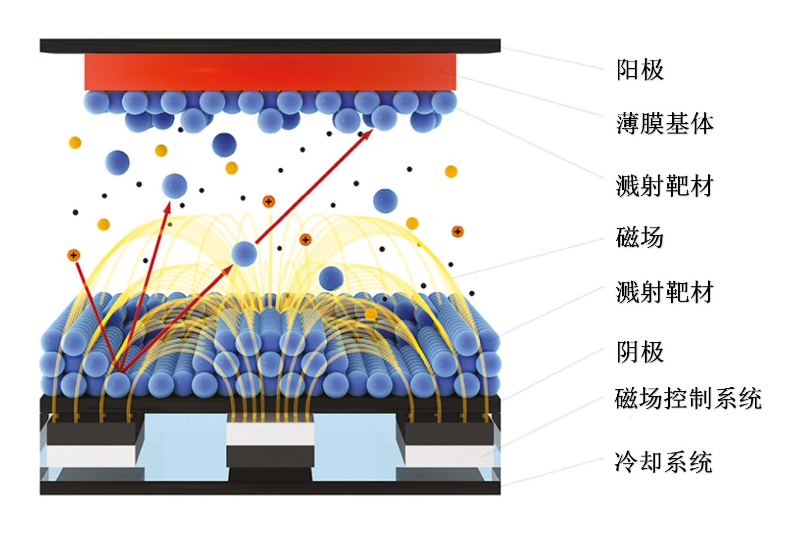 磁控濺射屬于輝光放電范疇,利用陰極濺射原理進行鍍膜。膜層粒子來源于輝光放電中,氬離子對陰極ITO靶材產生的陰極濺射作用。氬離子將靶材原子濺射下來后,沉積到襯底表面形成所需ITO膜層。