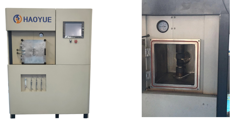 圖2上海皓越生產(chǎn)的放電等離子燒結(jié)爐(左)外觀(右)爐內(nèi)構(gòu)造