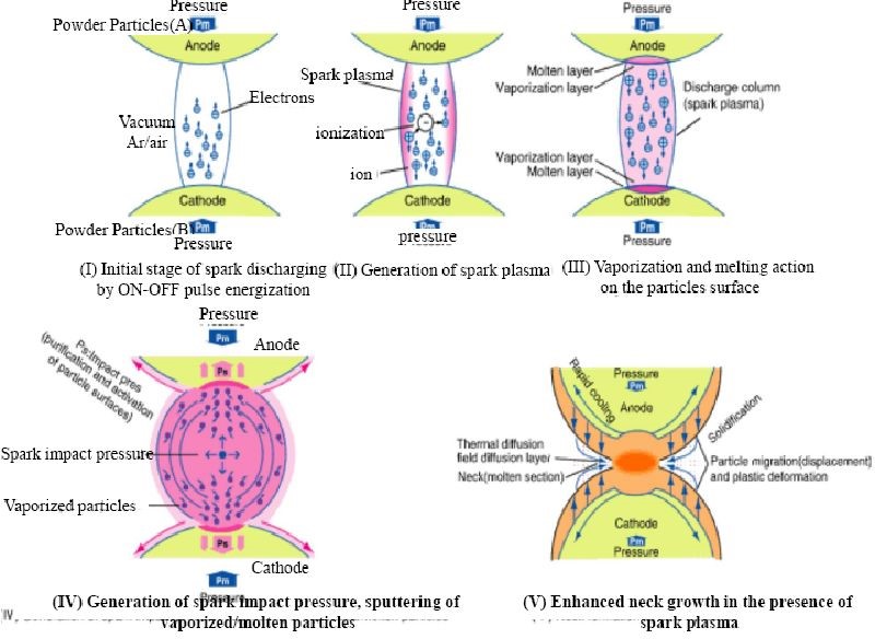 最初由Inoue和SPS工藝等人研究認為,脈沖電流在顆粒觸點之間產生高溫火花甚至等離子體,這也是該工藝被命名的原因。而Inoue等在之后的研究中認為由于火花放電引起的粒子接觸電離產生了“脈沖壓力”,促進了原子在接觸處的擴散。Groza等研究提出脈沖電流在顆粒表面上具有清潔效果,而顆粒之間沒有形成氧化。